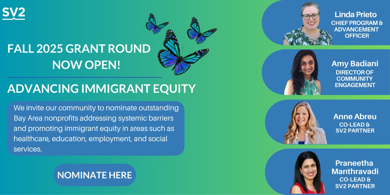 accelerating equity in the Bay Area through grantmaking and impact investing. For over 20 years, SV2 has been a trusted social innovation leader supporting locals to connect, learn, and practice giving in community alongside their peers.