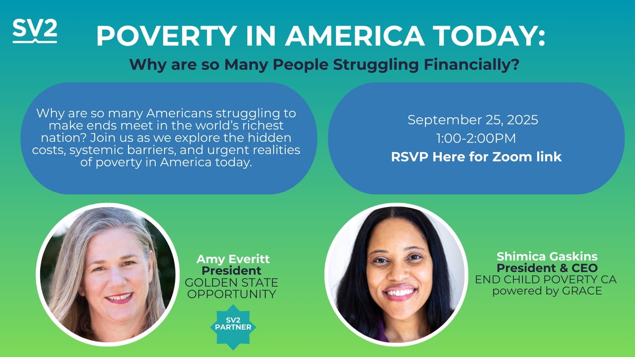 We are excited to launch our series Poverty in America Today. Whether you joined our May kick-off event or not, join us for this important conversation examining why so many Americans are struggling to make ends meet in the world’s richest nation. Explore the hidden costs, systemic barriers, and urgent realities of poverty in America today. Amy Everitt, SV2 Partner and President of Golden State Opportunity, and Shimica Gaskins, President & CEO of End Child Poverty CA powered by GRACE, will be in conversation, sharing their expertise and insights on the urgent fight against poverty in America.